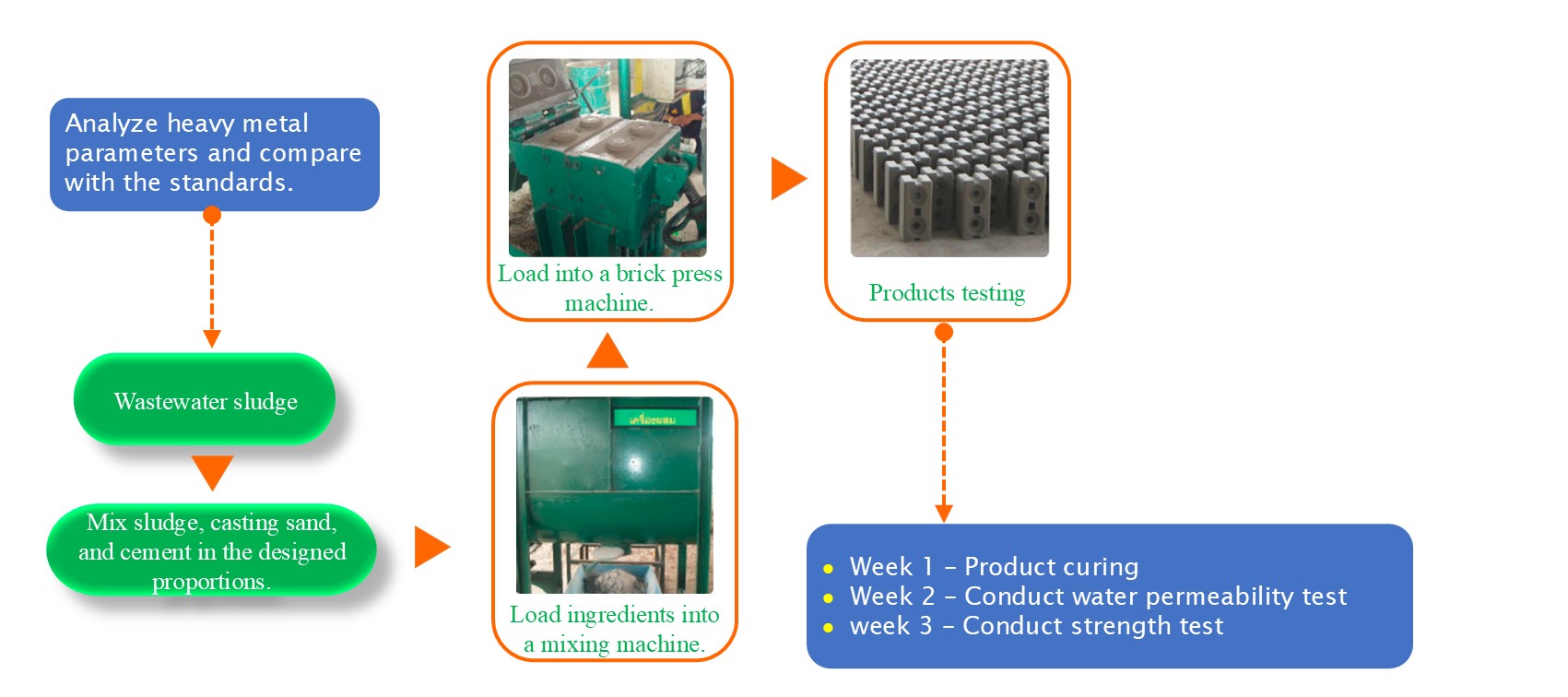 • Wastes or unused materials mixed with cement and water for producing interlocking bricks, paving bricks, concrete blocks, or concrete rings for a septic tank