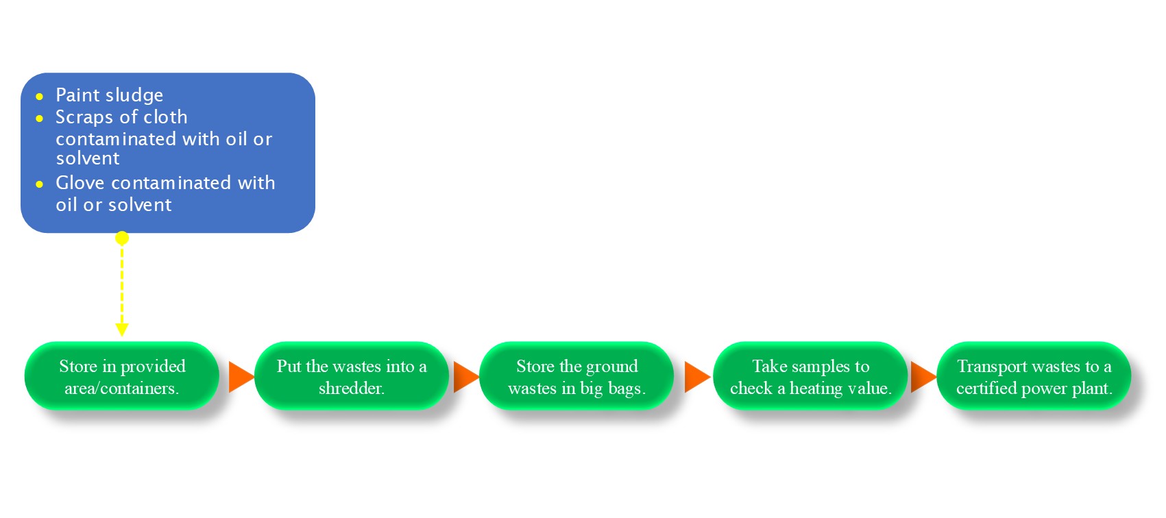 • Paint residue, paint sludge, contaminated fabric scraps, and contaminated gloves (containing paint, oil, or solvent) through blended fuel process